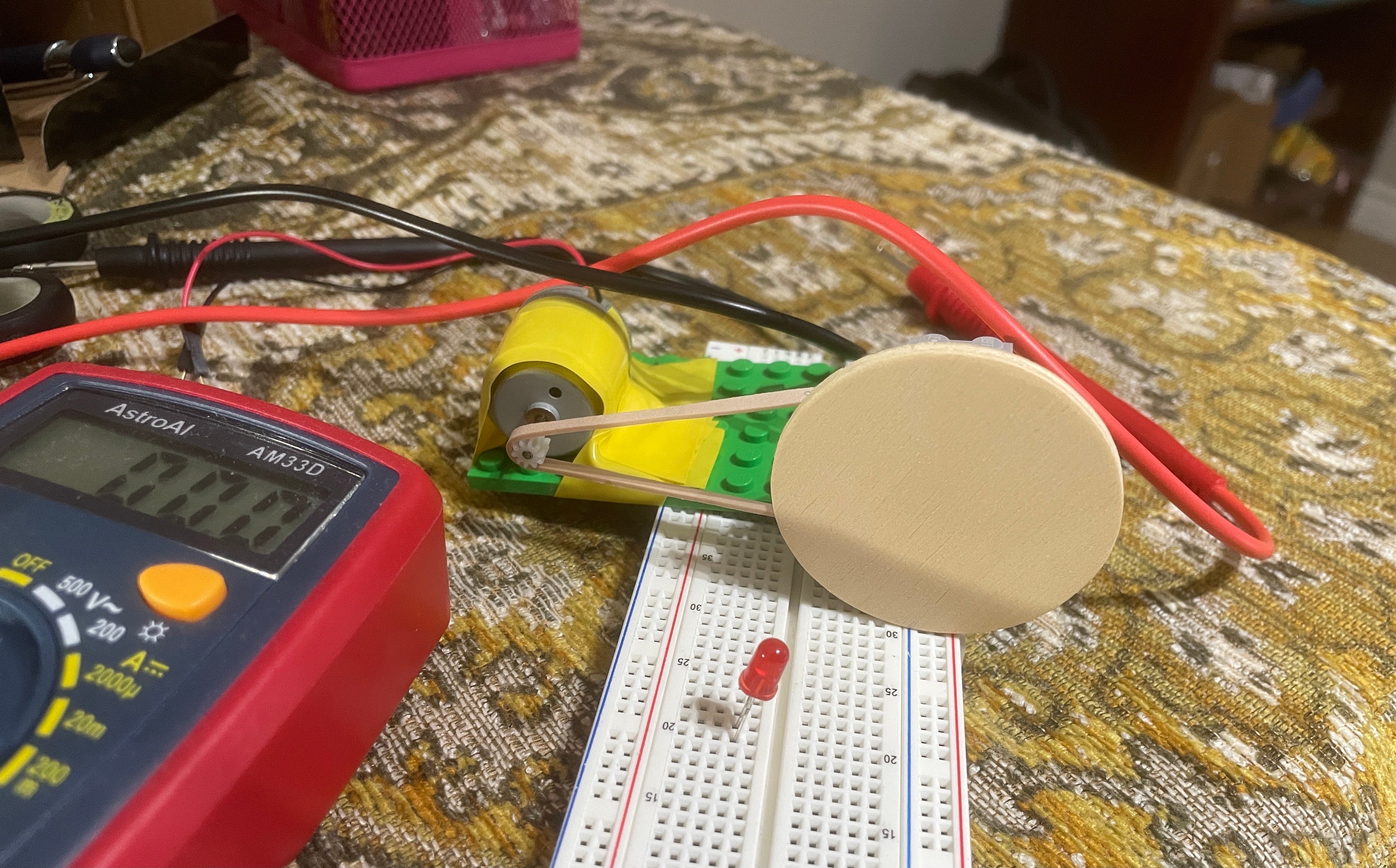 :// Now that summer’s out, I’ve trying to build a wind turbine again. Right now, I’ve hot-glued a circular “rotor” to a janky LEGO wheel (#bescrappy), which I’ve hooked up in reverse to a DC motor with some elastic band as my transmission. Soon enough, I’d like to scale up the design, make a bunch of them, and then place a few outside my school to power an outdoor music system or a cool-looking neon sign.